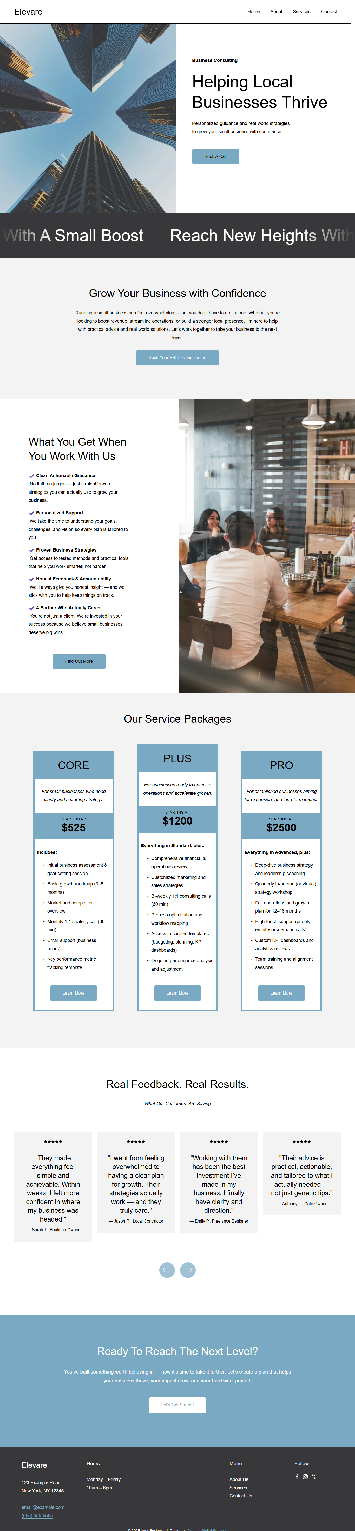 The Elevare Template is built to help service-based businesses showcase their expertise, build trust, and convert visitors into paying clients. Its clean design, bold typography, and strategic content layout guide potential clients seamlessly from first impression to booking a call.